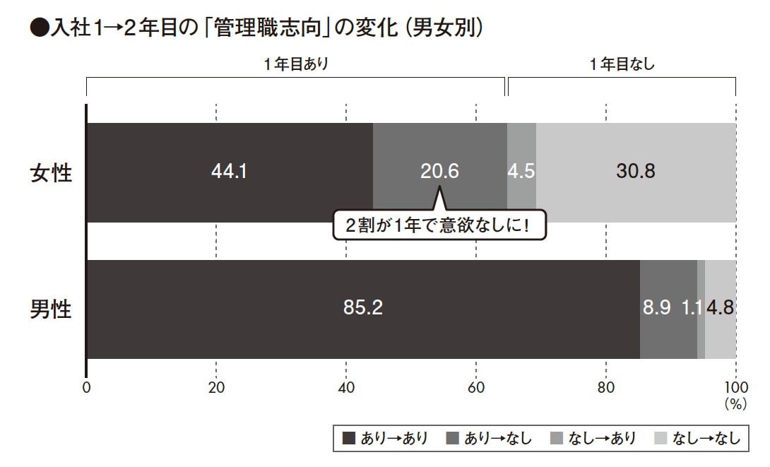 しかし、現実的に入社してしまうと、1年目で女性の昇進意欲が下がってしまいます。