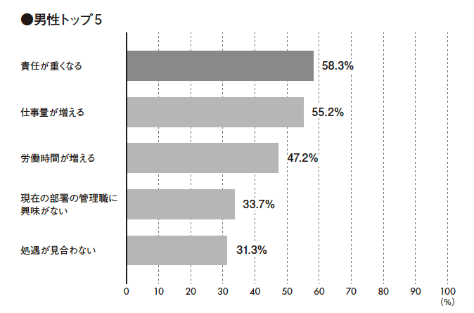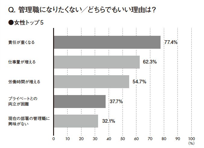 「管理職になると滅私奉公させられて、プライベートが犠牲になる」 私が、管理職候補の女性への取材や調査で、すでに何十回も聞いた言葉です。 実際、アンケート調査をすると、昇進をためらう女性の多くが、その理由を「プライベートとの両立が困難になるから」と答えており、その割合は男性より圧倒的に多いのです。