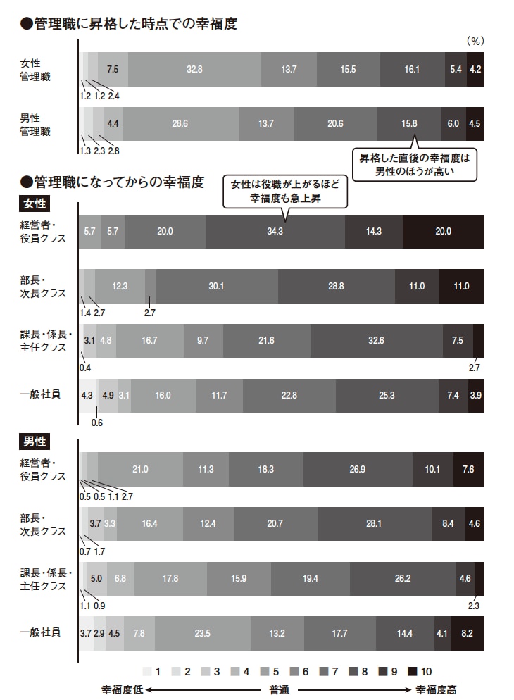 私は、それこそ10年以上前、『プレジデント』編集部にいる頃から、この手の調査を何度も担当してきましたが、結果は毎回だいたい同じです。 昇進意欲は女性より男性のほうが高いのに、管理職女性たちの幸福度は男性よりも高いのです。「ためらっていた管理職、なってみればとっても幸せ」が現実なのです。 私自身、昇進できてとても幸せです。