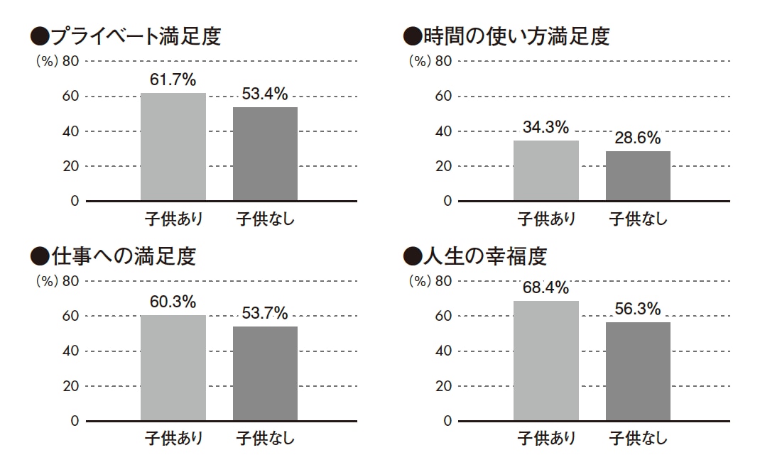 ところがどっこい、実は子供のいる管理職は、さらに幸福度が高い(ちなみに、離婚した子持ち管理職女性の幸福度は、さらに高いです)。 プライベート、仕事、時間の使い方、すべての項目で子供のいない管理職女性より、子持ちの管理職女性に軍配があがっているのです。