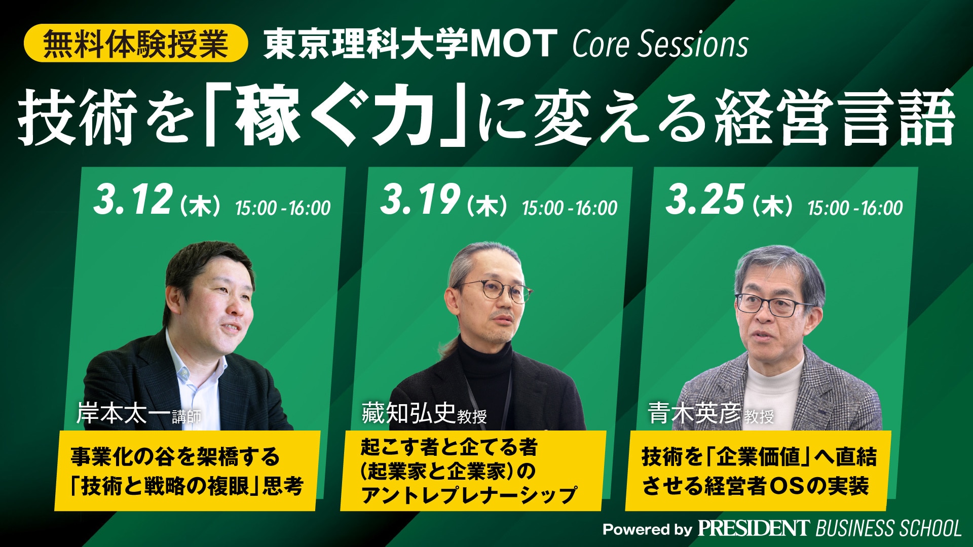 東京理科大学MOT Core Sessionsは、技術経営の核心を学んでいただくために設計された学位取得を目的としない学習プログラムです。修了されても経営学修士などの学位は授与されるものではございません。あらかじめご了承ください。
