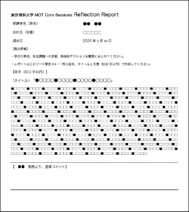 「MOT Core Sessions」では、受講終了後に任意でリフレクション・レポートをご提出いただけます。提出されたレポートには、適切な担当教授が丁寧に目を通し、具体的な助言と実践的な示唆をお返しします。単なる講座の振り返りにとどまらず、自社課題への応用や、自身の次のアクションにつなげることができます。