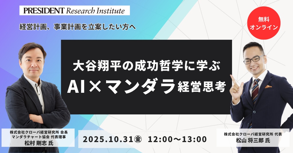 プレジデント総合研究所では、マンダラチャートの開発を手がけたクローバ経営研究所 松村剛志会長と、マンダラチャートを用いた人事評価制度構築・チームビルディング研修を展開する 松山将三郎代表をお招きし、特別セッションを開催します。