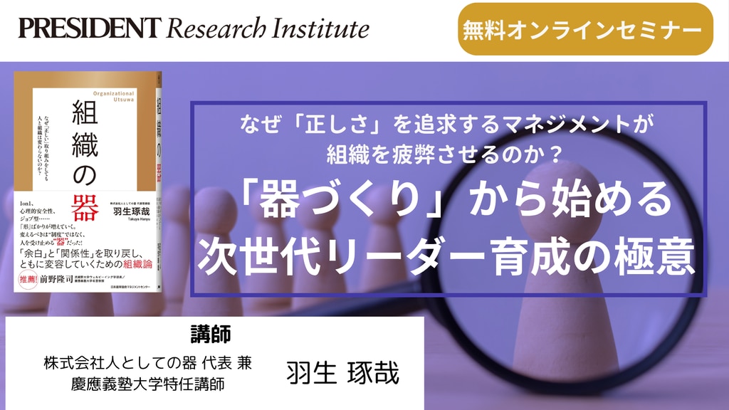 「正しさ」だけでは人は動かない!最新刊『組織の器』の出版を記念し、著者の羽生琢哉氏が登壇。1on1などのトップダウンの人事施策が形骸化する原因を紐解き、リーダー自身の「器づくり」から始める、人と組織を根本から変える育成の極意を解説。